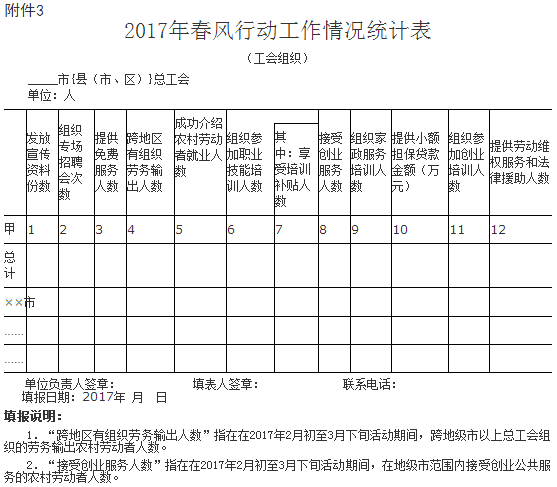 (四)及时统计总结。各县(区)人力资源和社会保障部门、扶贫工作部门、工会和妇联组织要加强与上级部门的沟通联系,及时准确做好统计、汇总和上报工作。各县(区)人力资源和社会保障局、扶贫办、总工会和妇联组织应于2017年1月16日前分别上报本部门负责春风行动工作的联系人和联系方式,并于2017年3月15日前上报本部门开展春风行动情况总结和统计表。