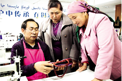 近年来,新疆福海县积极推进人才梯次培养工程,根据岗位需求、行业性质,组建“名师指导团+本土技能人才”帮带对子,在理论、实操等方面进行传帮带,有效开辟提速本地人才成长成才“快车道”。图为近日,在福海县萨亚哈萨克刺绣文化艺术传播有限公司,刺绣名师现场指导本土“绣娘”掌握旅游产品刺绣的相关技能。(胡玉萍 马晓丽 摄)