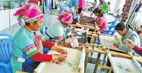 近年来,砚山县妇联充分发挥应菊山羊养殖农民专业合作社、白沙坡纸艺刺绣农民专业合作社、盛泽鑫种植养殖农民专业合作社、顺荣养殖农民专业合作社等4个巾帼脱贫示范基地作用,开展养殖、手工刺绣等培训,让广大农村妇女实现居家灵活就业。图为维摩乡白沙坡纸艺刺绣农民专业合作社的妇女正在学习刺绣技术。(通讯员 周建富 摄)