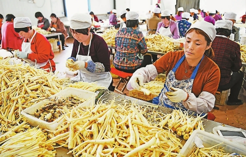 近年来,山东省淄博市沂源县南鲁山镇凭借桔梗产业优势,集中打造了5个扶贫车间,并在全镇建起65个桔梗加工小微扶贫站,覆盖全镇41个村,形成了“产业协会+企业扶贫车间+小微扶贫站”的扶贫新模式,吸纳周边贫困人员务工,助力贫困户脱贫。图为近日,工人在山东省沂源县南鲁山镇一桔梗扶贫车间内加工桔梗。(董乃德 摄)