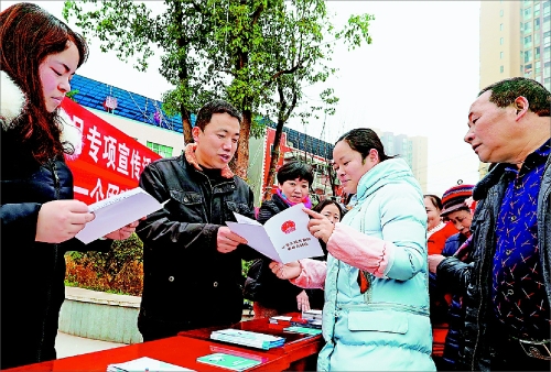 近日,重庆市沙坪坝区回龙坝镇举办2019年就业援助月宣传活动。 据了解,春节期间,该镇还将开展现场招聘活动,为企业、劳动者搭建对接平台。图为活动现场工作人员向群众宣传相关政策法规。(孙凯芳 摄)