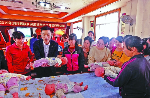 广西桂林市加大对深度贫困地区脱贫攻坚工作力度,2019年计划培训以深度贫困地区贫困人口为主要对象的城乡劳动力2.8万人,确保每一位有培训、就业愿望的贫困劳动力均能在家门口享受到培训和就业服务。图为日前,在深度贫困乡洞井瑶族乡举办的育婴师培训班上,学员在学习婴儿护理技能。(李志奇摄)