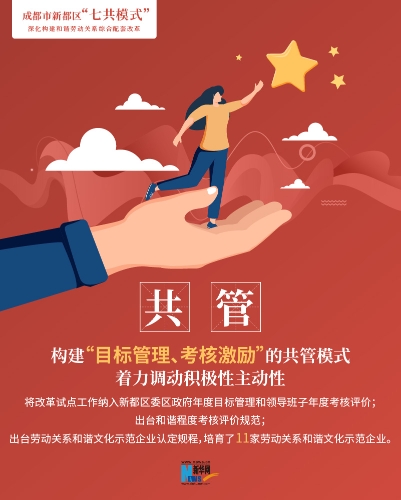 成都市新都区是全国“构建和谐劳动关系综合配套改革”试点地区,2019年11月试点启动以来,探索构建和谐劳动关系共治、共商、共管、共建、共优、共享、共创的“七共模式”,为四川省以及全国构建和谐劳动关系提供了可借鉴的实践样本。