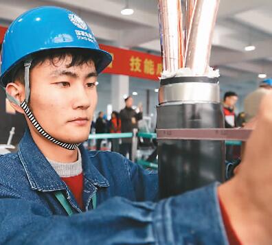 图为2017年华东地区首届10千伏电力电缆终端安装技能比武大赛中,参赛选手在进行制作。(章勇涛 摄 人民视觉)