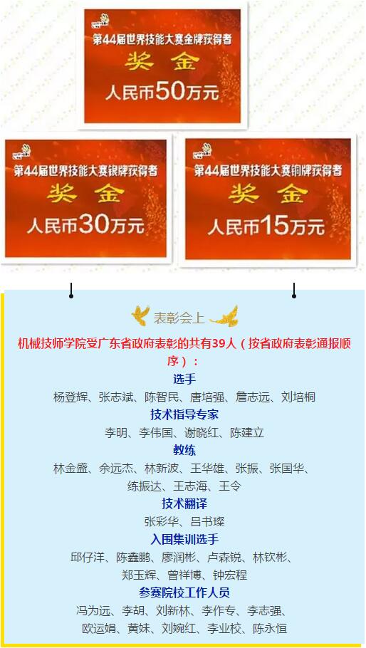 3月29日,广东省参加第44届世界技能大赛总结表彰大会暨备战第45届世界技能大赛动员会在广州召开。广东省机械技师学院在44届世赛中做出杰出贡献,受到了广东省人民政府的嘉奖,予以记大功;学院技能竞赛与师资培训科、机电工程与智能控制系获颁“广东省五一劳动奖状”;综合机械与自动化项目专家组组长、学院副院长谢晓红被光荣授予“广东省三八红旗手”荣誉称号,学院世赛金牌获得者杨登辉、张志斌被光荣授予“广东省五四青年奖章”,并分别荣获奖金50万元;综合机械、数控车项目银牌选手唐培强、陈智民分别荣获奖金30万元;制造团队挑战赛项目铜牌选手詹志远、刘培桐分别荣获奖金15万元。