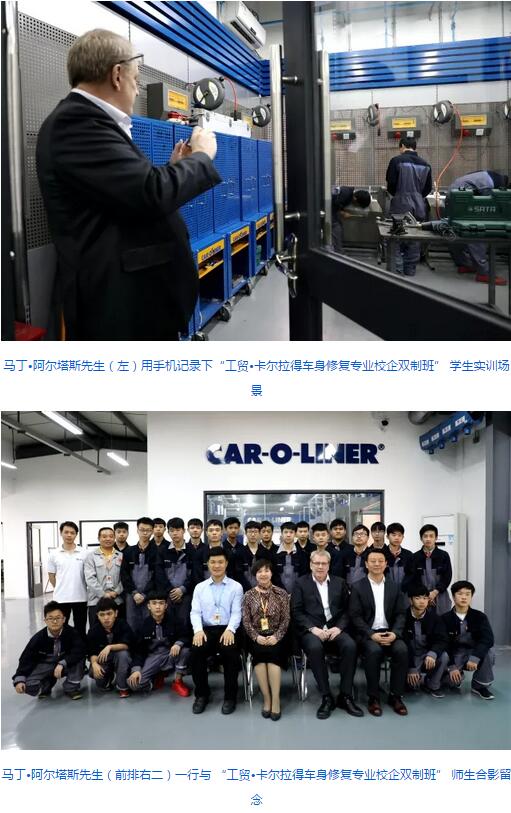在“精工求品质 极致而至善”办学成果展厅,马丁·阿尔塔斯先生观看了学院宣传片《技能信仰》后,表示很受震撼,提出要带回公司播放给全体员工观看,告诉他们什么是技能魅力,什么是技能信仰。展厅中目不暇接的学生学业成果更让马丁·阿尔塔斯先生由衷赞赏“Very nice!”、“Very impressing!”在得知酷炫的巴哈赛车是由学院新能源应用产业系师生团队研发组装而成,马丁·阿尔塔斯先生惊喜问到“Can I drive it?”马丁·阿尔塔斯先生还驻足阅读学院编写的《汽车检测与维修专业国家技能人才培养标准及一体化课程规范》及相关教材,表示这些教材与目前卡尔拉得培训学院的课程体系开发理念、技术规程、培养标准、教学策略都十分相似。“Nice place,I do like your school!”在卡尔拉得培训学院(广州)培训中心,看到校企双方的设备投入、场地建设、双制班学生现场实操等情况,马丁·阿尔塔斯先生倍感兴奋,并表示十分期望与学院多研讨、多合作,共享资源、共同发展。