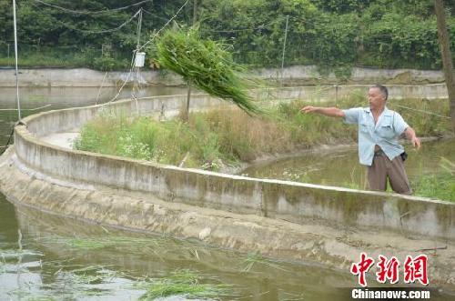 竺山村水产扶贫产业合作社鱼塘边,村民正投放青草喂鱼 余皓 摄