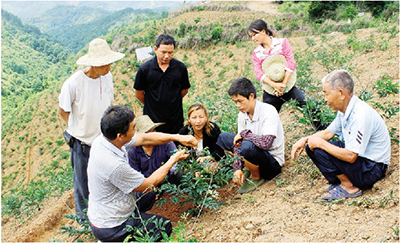今年以来,广西藤县创设“田间课堂”,组织由农技人员、种植大户、致富能手等组成的农技服务小分队,由农民“点题”,农技人员“下厨”,面对面讲解各种种养技术,为农户解困惑、破难题,降低农技进村入户的门槛。图为土专家(左二)指导种植户根据作物生长的特殊规律修剪枝条。(童耀东 摄影报道)