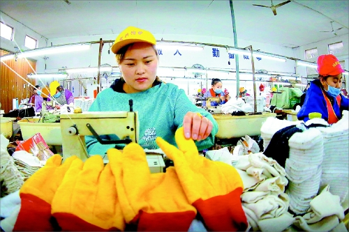 近年来,江西省峡江县通过大力开展工业园区定向培训、员工岗前培训,帮助返乡人员提升劳动力就业技能,实现家门口就业。目前,该县1万余名返乡劳动力在家门口的县镇村企业就业,成为当地企业的骨干力量。图为近日,经过技能培训的女工在生产车间里加工防护手套。(张荣芳 曾双全 摄影报道)