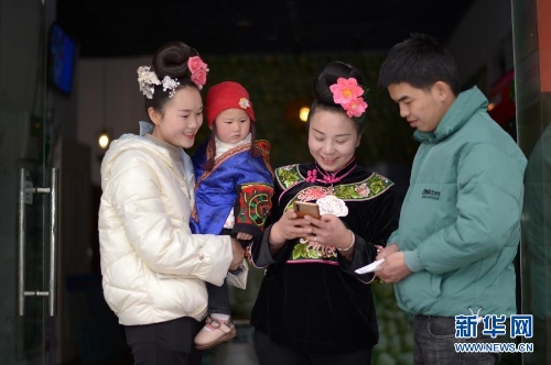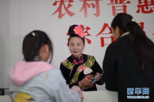 3月7日,在贵州省黔东南苗族侗族自治州台江县南宫镇电商站,熊明英(中)向客户介绍银行卡绑定网银业务。