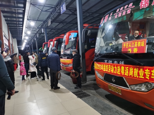2月9日,锦屏县在抓好疫情防控的同时,劳务输出持续发力,该县90名务工人员乘坐大巴车赴从江站换乘前往广东方向的D2803次列车。