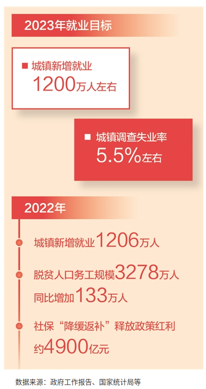 政府工作报告提出今年发展主要预期目标中,城镇新增就业1200万人左右,城镇调查失业率5.5%左右。