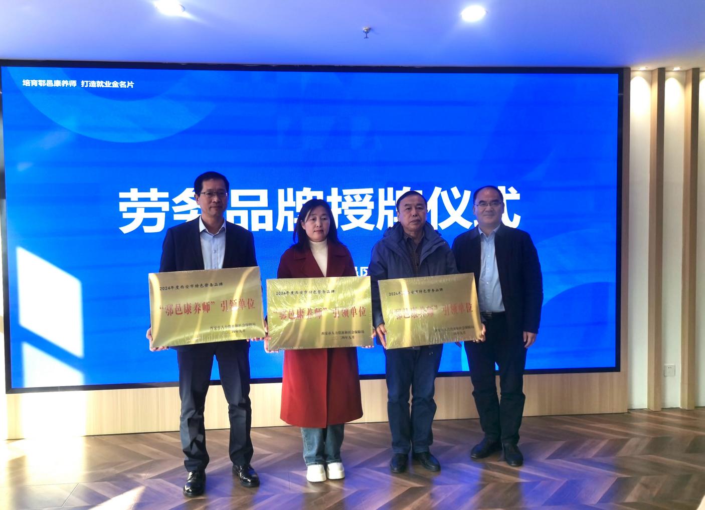 现场为鄠邑区授予西安市特色劳务品牌牌匾,为陕西国防工业职业技术学院、西安医药科技职业学校和西安市鄠邑区鑫诺职业技能培训学校三所学校授予“鄠邑康养师”引领单位牌匾。