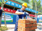 近日,“携手长三角,共建G60”2019年安徽·宁国-浙江·安吉省际建筑行业劳动技能竞赛在安徽宁国市举办。图为在砌筑工比赛现场,师傅们挥舞着砌刀向观众展示高超砌墙技艺。(崔光宝 摄)